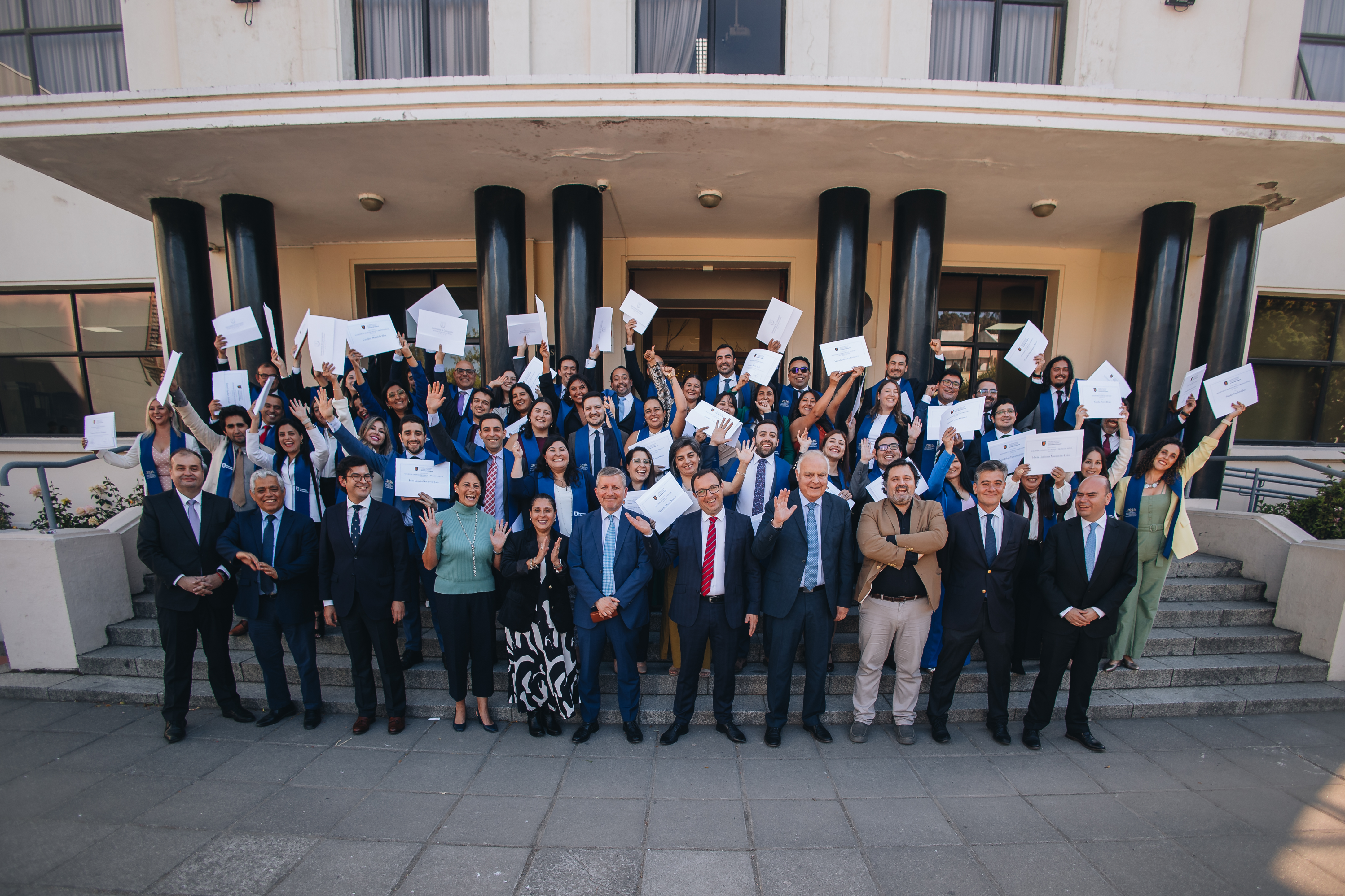 El encuentro finalizó con una fotografía oficial en el frontis de la Facultad, momento que reunió a las y los graduados junto a autoridades y académicos, sellando así una jornada de celebración para la comunidad de postgrado de la Facultad de Ciencias Jurídicas y Sociales.